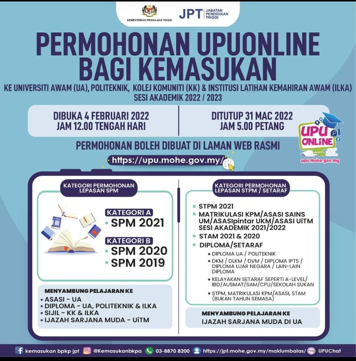Permohonan upu online bagi kemasukan ke Universiti Awam kini di buka bermula 04 Februari 2022 jam 12 tengahari sehingga 31 Mac 2022 jam 5.00 petang.